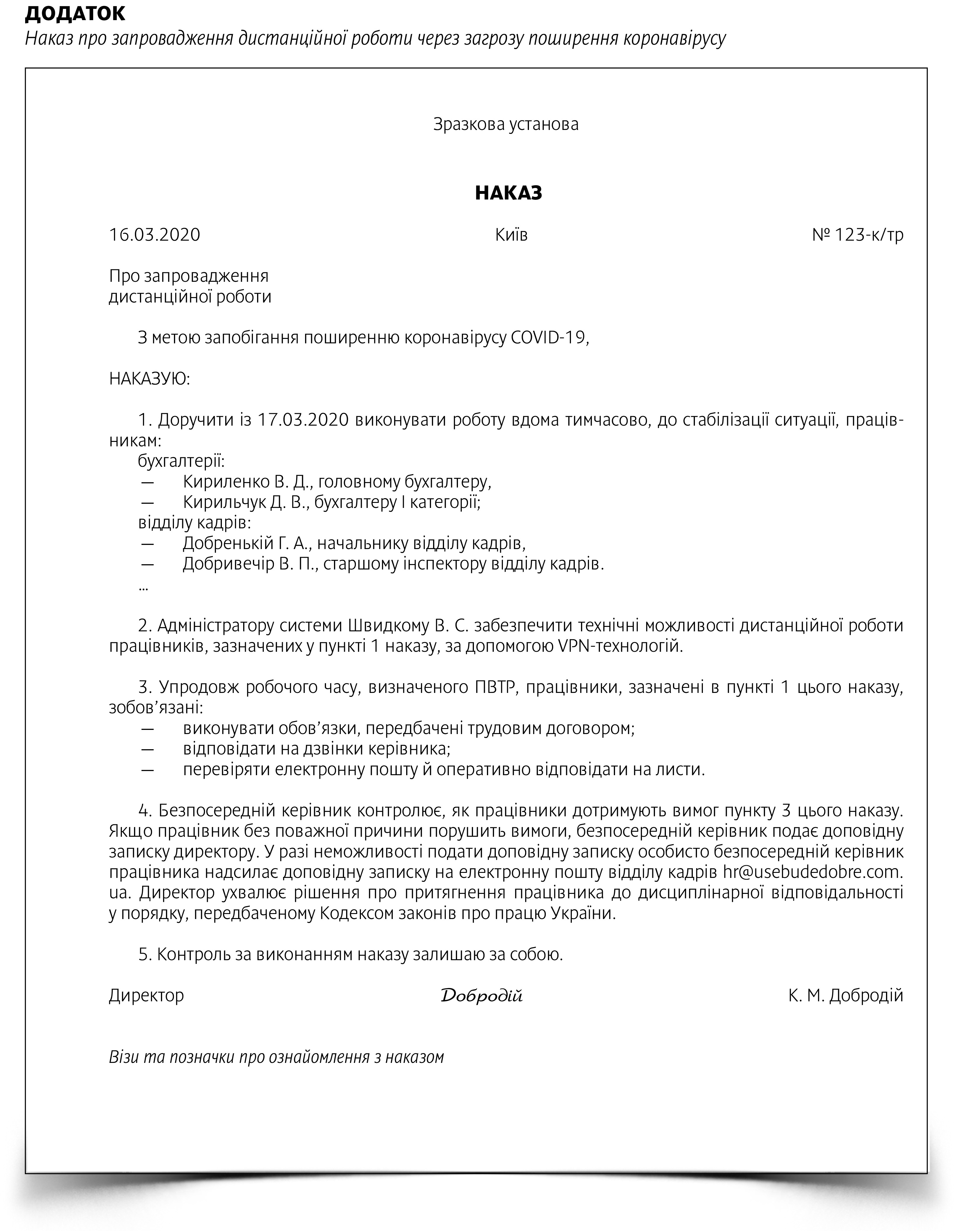 Обидві заяви оформлюються звичайним способом справа зверху шапка - Директору такому-то від працівника такого-то посада прізвище імя та по батькові далі по центру Заява потім текст після дата та підпис. Заява про переведення на дистанційну роботу у звязку із COVID-19коронавірусом далі Заява - документ який направляється роботодавцю з проханням працівника про переведення його на дистанційну роботу через епідемію коронавірусу COVID. Тож якщо йдеться про запровадження дистанційної роботи за ініціативи працівника або під час карантину чи обмежувальних заходів попросіть працівника написати заяву.