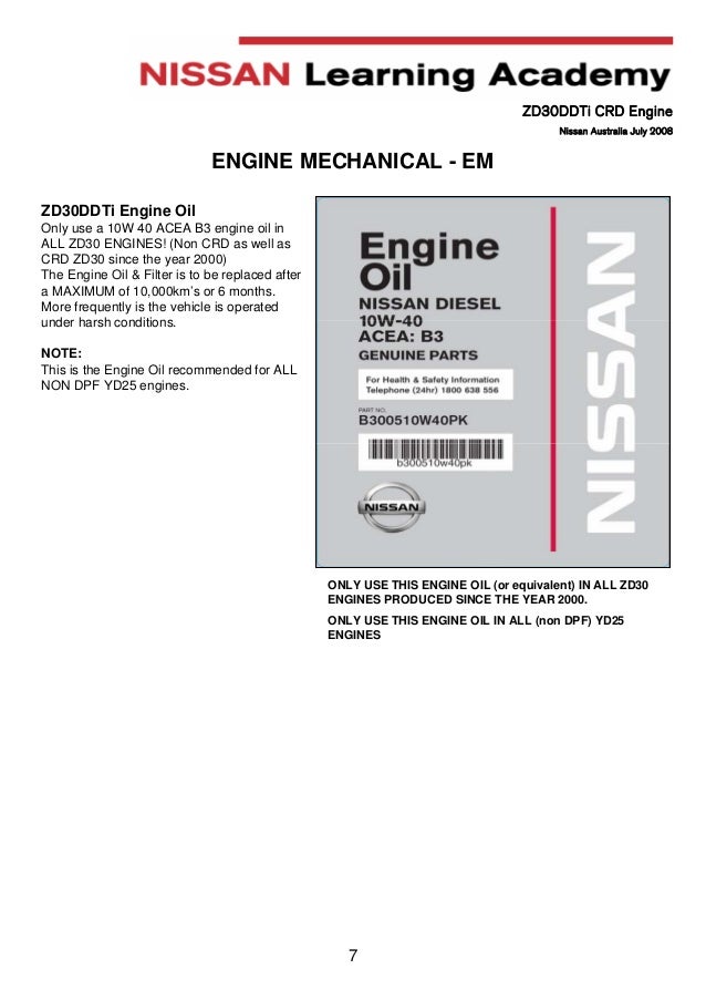 ZD30DDTi CRD Engine Nissan Australia July 2008 ZD30DDTi Engine Oil Only use a 10W 40 ACEA B3 engine oil in ALL ZD30 ENGINES. The Nissan SD33 most known for its use in the Nissan Patrol MQMK 160 series. To buy the right oil you need to know SAE viscosity index and API quality oil for diesel or gasoline engine.